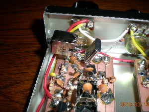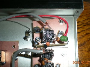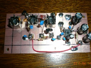 VXO部を配線しますが、三次元的な配線で何か悪い配線の例に出される所謂「もやし配線」になっています、こんなんで大丈夫かなと不安になります。(2009/3/12)このVXO部をケースに取り付け、ボリュームやトグルスイッチなどに必要な配線をします。これも一部空中配線になっています。 いよいよ電源を入れて調整に入ります。まずRFプローブを当てて発振を確認しますが、「アレ」発振していないコイルのコアを回してみますが全く反応無し、各部の電圧を測ってみますが異常はないみたい、各ランドへのRやCの取り付けも間違っていない。 念のため発振段の2SC1906の取り付けを確認するとなんとベースとエミッタが逆になっていると言う単純ミスでした。早速付け直しをしましたがそこはランド方式のいいとこで、すこぶる簡単にできました。 発振が確認できたので、今度は周波数カウンターでいよいよ調整です。18.0MHzの水晶を使っていますが基本波の範囲は18.00347MHzから18.00652MHzで3KHz程度動いています。RFプローブを当てながら10S50のコイルを調整してピークを取りましたが、周波数は54MHz台でこれでは3逓倍です、さらにコイルを調整すると72MHz台になり一安心。 2段目のコイルを調整すると144MHz台が出てはきましたが、RFプローブの出力は一段目と比べると極端に低い十分同調してない様子、多分浮遊容量の関係で10S144に抱かしているコンデンサーが7ピコでは多すぎるのではないかと思いますので5ピコにして再度調整したいと思います 。(2009/03/13) 10S144に抱かしているコンデンサーを5ピコにしてみましたが、あまり変化ありません。10S144のコアをいじくり過ぎたのか、片方のコアが動かなくなってしまいました、コアを動かしても出力に対する反応が鈍いのでこのままで良いことにします。 電源コントロール部と受信部の基板の切り出しを行いました。次は電源コントロール部です。(2009/03/14) ![]()