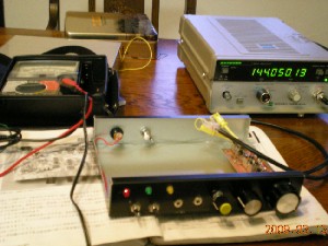 QS0の機会を増やすためにはもう少し上の方144.090MHzぐらいまで周波数の範囲を広げる必要があります。以前特注した18.0060MHzの水晶を使ってみます。18.000MHzの水晶と入れ替えてみると何と想定とは逆に周波数は下がってしまい上限でも基本波がやっと18.001MHzです。これでは使えません。次に水晶とコンデンサーの間に10μHのチョークコイルを入れてみると上で144.050MHzになりました。もう少しインダクタンスを下げれば、もう少し周波数は上になると思い10μHのチョークコイルの替わりにFCZのVX3を入れてみます。 コアを抜いていくと144.080MHzぐらいになります、下は144.030MHzぐらい50KHzぐらい動いています。しかし144.60MHz以上になると発振強度が弱くなりパワーが出ません。 このままでは実用範囲は144.30MHzから144.60MHzぐらいと考えられます。「本」の回路にVOX3を入れただけなので仕方がないのかもしれません。 DSB機と比べると受信感度が少し低い感じがします、ただ両機で同じ信号を受信して比較したわけではないので良くわかりませんが。 (2010.03.12) 受信感度が低いので高周波増幅の2SK241を交換し、再調整しましたがまだ感度が上がりません。DSB機と同じ回路で同じように作ったはずなのにまったく感度が違います。RX部だけ作り直した方が早いかもしれません。 原因が特定できないのはまいりました。信号を受信できなければ交信はできませんからね。(2010.03.17) VXOを少しいじりました。VX3を取り外しクリスタルと並列に3pFのセラミックコンデンサーをいれました。クリスタルとバリキャップの間の18pFのコンデンサーもこの前後の値のものと入れ替えて試してみましたが、18pFがやはり良さそうです。 これで周波数の範囲は144.0858MHzから144.1058MHzとなりました。クリスタルと並列に3pFを入れて発振が安定しました。 受信の調整も行いました。144MHzDSB機のVX3のコイルを調整し、下限が144.75MHzぐらいまで低くくなるようにしました。 144MHzDSB機を144.90MHzで受信状態にして、このVXOのキャリアを使ってCW機の受信調整をします。調整の結果かなり感度は改善されたとは思いますが実際の信号を受信してみるとICー706MK2GMで599の信号がこの受信部では存在すら確認できませんでした。どこに原因があるのかアンテナ回路部を中心に精査したいと思います。 (2010.04.08) 感度不足に悩んでいるのに矛盾していますがアンテナ回路に10kΩのボリュームを入れ強力な信号に対する備えをしました。 感度不足に対応するため高周波増幅の2SK241を2SK439Eにしてみます。ただ単に置き換えたら、見事に発振してしまいました。 かなり敏感です、JA1CRJ千葉さんの「ビギナーのためのトランシーバー製作入門」を参考にして2SK439Eのソースに220Ωと0.01μF入れたら発振は止まりました。調整しながら感じたのですがこちらのほうがゲインはありそうです。しかし、現時点でまだ局は受信できていません、ICー706MK2GMでも受信できていないので本当に感度が上がったのどうか確認できません。144.70MHzぐらいまで周波数を下げられれば出てる局もあるので確かめられるのですが。さて、その方法あるのか?(2010.04.09) 今、クリスタルと並列に3pFのセラミックコンデンサーを入れていますがこのコンデンサーの容量を変えたらどうなるか試してみました12pFではかなり周波数は下がりますが(144.055MHz程度)、全体的に発振出力が落ちて実用になりそうもありません。そこで少しだけ増やして様子を見ました。まず6pFでの周波数の変化は144.073MHzから144.089MHz程度ですが上限に近づくと極端に発振出力が落ちます。5pFでは144.077MHzから144.093MHz、4pFでは144.087MHzから144.098MHzになりました。安定して発振して希望する範囲に近い5pFにすることに決めました。 またVXO部の4逓倍している10S50を再調整し72MHzのピークを取り直ししました、その結果144MHzの出力も大きくなります。送信状態にしてFCZのパワー計で計ってみると約15ミリワットに増えていました。これは期待できると思いましたがその夜はこの周波数帯に強力な出てこず空振り残念でした。(2010.04.10)