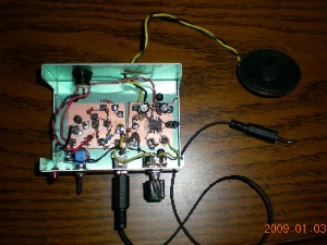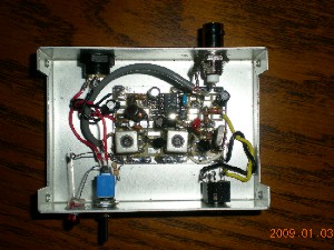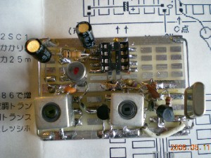 残った配線を終え、ケースに入れてみました。以前作ったQRP用のパワー計を目安に説明書のとおり調整をしていきます。10ミリワット以上は出ているようです。キットに入っていたコンデンサーマイクを使って送信しIC706MK2GMで受信してみても上手く変調がかかっているのか良くわかりません。そこで、自作したツインT低周波発信器から約800Hzを入れてみると変調はかかっているようですが、少し出力が下がります、所謂マイナス変調になっているようです。これが正常な状態なのか調整不足よるものかわかりませんが一応完成ということにしておきます。 JF1RNR今井さんの「手作りトランシーバ入門」にあるツインT発振器とLM386のアンプです。ランド方式による配線方の習作のつもりで作ってみました。今後いろいろ便利に使えそうです。