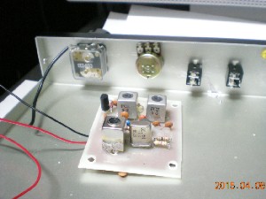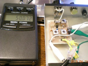 結論から言えばVXO部は回路的には作動させることが出来ました。ここに至るまで、各部の電圧の確認、VX3を外したり、クリスタルを外して基本波で発信することを確かめたり、誤った値のC,Rが接続されていないか点検した結果、各部品には異常のないことが確認できました。今度は各コイルの調整で動くかです、そこでポリバリコンの代わりに15ピコのセラミックコンデンサーを入れて調整をした結果50メガを出力してくれました。基本波で発振させその3倍の高調波を取り出す方式のVXOなのですが周波数カウンターで見たところ2倍の高調波が出力されていたのでコイルを再度調整して50メガになりました。逓倍は難しいですね、簡単な測定器でも周波数や出力をみる道具は必要ですね。今回は押し入れの奥に入れておいた以前自作した簡単なFCZの測定道具を持ち出して対応しました。(2015.04.11)