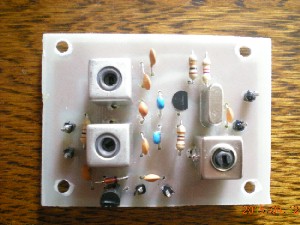 まずVXO部が動かないことには何も始まらないのでVXO部をまず組んでテストしてみます。オリジナル回路と違っているところはVX3のコイルをクリスタルに直列に入れ周波数の可動範囲を広げたこと、手持ちの3端子レギュレーターの関係で2SC185のコレクタ電圧が5ボルトと低めに設定したことです。簡単に基本波を発振し3逓倍の50メガが出てくると思っていたのですが、発振してくれません。写真では撮影の都合でケースにプリント面が付いていますがテストの時は離してあり、ポリバリコンにも繋いであります。パターンのミスも無いようですし少し頭を冷やしてから検討します。(2015.04.10)