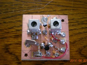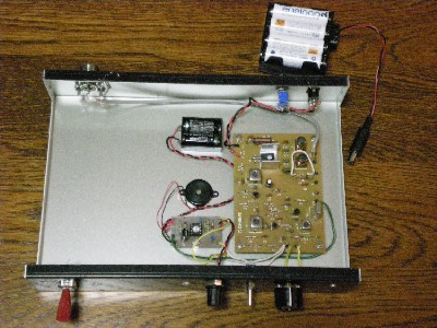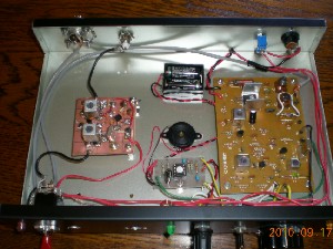その後、秋葉原にいって必要な抵抗などを仕入れ、組み立てを再開、ケースにポリバリコンなど取り付け仮組みをしました。電源は単3型エネループ8本直列で供給することにしました。出力端子に50オーム2ワットのセメント抵抗をダミーロードとして繋ぎます。小型の周波数カウンタでVXOが予定していた周波数付近で発振していることを確かめてから、RFプローブとアナログテスターを使ってそれぞれのコイルを調整していくと思っていたよりあっさりとパワーが出てきて、ダミーロードのセメント抵抗が熱くなりました。 VXOの調整は本格的にくみ上げた段階で行うこととしました。 次に、ついでに買ってきたキャリブレーションのキーヤーも組み立て、これも単独では動作することを確認しました。 次回はこれを組み込んでとりあえず送信機は完成となります。