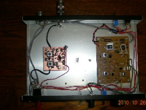 旧型SR−7のユニットをはずして、クリコンに換装しました。ケースが大きいのでガランとしてしまいました。FT−817に繋いで調整しますが、FCZ10S3R5に記事のように220pFを抱かせましたが、コァを回しても同調点がはっきりしないので330pFに変更して調整しました。 7MHz側のコイルも調整しますがこれも同調点はかなりブロードです。 実際に7MHzのCWとSSBを聞いてみましたが、感度、選択度もまずまずですが、ノイズが多い感じはします。 これで何とか初交信できればいいなと思っていますが、東京のシャックのアンテナはしょぼく、QRPでは交信は難しいと思うので嬬恋村のセカンドシャックで挑戦してみたいと思っています。(2010.9.17)