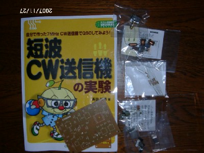 CQ誌の出版広告に出ていた「短波CW送信機の実験」(高田継男著)を購入し一読してこれなら何とか作れそうだし、主要な部品もミズホ通信(株)で一括購入できると言うことなので、このモデルを作ることにしました。しばらくして、ミズホに購入の電話をしたところ、著者本人の高田OMが直接出てこられたのでびっくりしてしまいました。今は記念発売なので必要な抵抗一式もサービスするといわれ即注文をしました。代金は品物が着いてから後から送金すればいいとのおおような対応で感心しました。品物は2日後には手元に届き満足です。 画像は本と付録の基板、送られてきた主要部品の一式です。このほかに必要なものは、ケース、つまみ、スイッチ、各種ターミナル類、配線材料ぐらいでしょうか。 11月28日現在では何かと所用があり未だ組み立てを開始していません。