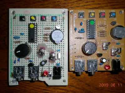 CQ誌2008年6月号で紹介され基板が付録で付いてきた「4チャンネル・メモリPICキーヤー」OIKeyF88を作られた方も多いと思います。私も秋葉原の秋月電子まで行ってパーツセットを購入し早速組み立てました。簡単にできたわりに実用性が高いのに驚かされ、セカンドシャック用に今度は秋月の通販でこのパーツセットのみを入手し、昔買って使わずとってあったサンハヤトのユニバーサル基板に組んでみました。この基板の方がやや大きいので簡単に組めるかなと思ったのが大間違いで、細かい作業で手間のかかること。また組み立て途中でステレオジャックの口が基板にかかりプラグが差し込めないことに気づき、基板を削って調整するなど間抜けなことしたりして大汗ものでした。さらには、かなり古い基板を使ったせいか半田ごての熱でランドが幾つか剥がれてしまい部品の固定が十分にできないなど苦労の連続です。特にトグルスイッチの部分は力がかかるのでホットボンドで格好は悪いですが補強しました。付録の基板を使った時は半日もかからなかったのに数日かけて組みあげる始末でした。 組上がってしまえば、デジタル回路ですからアナログの送受信機のように調整はいらないので、電源を投入したら一発で作動しました。当然ですが機能は付録のものと同様に動きます。 もしプログラムを書き込んだPIC16F88だけ入手できたら、他の部品は特殊なものなく殆ど手持ちの部品で間に合うので、もっと作りやすく使い勝手の良いものが出来そうなのですが。 私のテニスの友人でPICの書き込みができる人がいて公開されているプログラムをPICを持ってくれば書き込んでやるとのこと、この手の話は何時も手遅れで私がパーツセット買ったあとで聞きました。早く言ってよ。(2009.06.11) さてこのキーヤーですが、今、東京のシャックで使用中です。オリジナルのキーヤーは群馬県嬬恋村のシャックで使っています。現在東京のシャックではIC706MK2GM、群馬のシャックではIC706MK2を主に使っていますがCWのメモリ機能がないので本当に便利に使っています。開発者のJA1HHFの日高さんに感謝しています。 ふと気が付いたのですが、PICに張られている丸いシールの色が最初に買った時は「緑」、次のものは「黄色」になっていますが何か意味があるのでしょうか、使い勝手としては違いはわかりませんが。 (2009.06.24) 若干の問題が発生しました。Eスポでも出てないかと50MHz帯をワッチしていていると、50.16MHz付近で強力な信号が出ています。外からではなくシャック内で出てる信号みたいです。動いているのはキーヤーだけ、ひょっとして思いキーヤーのスイッチを切ると信号が止まります。犯人はキーヤーでした。10MHz帯を受信してみるとやはり10.032MHz付近で信号が確認できました、基本波の5逓倍の信号が飛び込んできてたのです。 主に7MHz帯や144MHz帯の運用が多かったので気付きませんでした。オリジナルのキーヤーでも同じ現象が発生するか次回セカンドシャックに行ったとき確認してみます。 対策は今思案中です、今週末は6メーター・アンド・ダウンコンテストだしどうしよう。 (2009.07.01) |