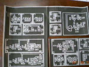 今回はJF1RNR今井さんの「ランド方式で作る手作りトランシーバ入門」の回路をプリント基板にしてみます。5年ぐらい前にPCBでパターンを作ってあったものを原図とします。ここで問題だったのは印刷用紙でサンハヤトの専用紙は高いので、A4のインクジェット用のトレーシングペーパーをビックカメラで購入しましたが通常の用紙に比べてこれもかなり高いです。果たして上手くパターンが印刷できるか不安でしたが取り敢えず試して見ます。印刷は出来ましたが、用紙がプリンターから出てくるとすぐ丸まってしまうのでビックリ、慌てて広げましたがその時良く乾いていない印刷面に触れてしまい、ベタの部分に指紋が少し着いてしまいました。(失敗その1)今回はあくまで感光基板現像とエッチング作業の確認が目的なので指紋が着いた原紙で試作します。