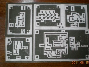 原図はA5(葉書サイズ)4枚分ですのでまずその一枚分を切り出し、A5版の感光基板に密着させクランプ板に挟みます。問題は露光時間です、露光機はサンハヤト「ちびライト」使いましたが、表示によると感光基板の製造後月数によって変わるとされ1年後では半透明フィルムで13分となっています。5年以上たったものですので見当もつきませんがこの13分で試す事にします。一見上手く露光できたように見えます。いよいよ現像、液温は35度少し高いかな、ところで時間はどのくらいだったけと説明書見ると一分以内です、大変だもう2分以上たっている、慌てて水洗いすると露光に反応して青色なった部分も