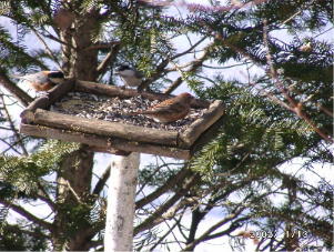 昨日より大分混雑しています、駐車場が昨日と違って畑みたいところで、おかげで靴もズボンの裾も泥だらけです、まいりました。 滞在時間は1時間だけです、リフト待ちは無いので1時間でも結構疲れます、最近は滑走時間が2時間以内ということ多くなっています。 餌台観察日記 写真は、たまたま餌台で一緒になったコガラ、ヤマガラ、オオマシコ(たぶんメス)です。今回は色々な鳥が山荘に来てくれました、常連のガラの仲間のほか、シメ(この鳥はいつも1羽で餌台にきますが、あまり長居はしません)、アカゲラ(愛嬌のある動作で笑わせます、でも極端に臆病者のようで人間の視線を感じるとさっさと逃げていきます。)、ウソ(数羽で来て比較的長居をする鳥です、レンゲツツジの実を啄ばんでいます。)、コゲラ(マユミの実を食べに来ます、落ち着かない鳥でちょこちょこと本当に良く動いています。)、カケス(今年は数が少ないようです。) | |