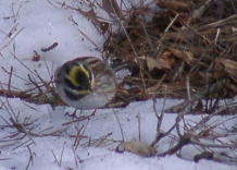| 2002/02/9 | 今日の午前中は小雪が舞っていて、スキーに行こうと思っていたのですが止めにしました、最近はすっかり軟弱者になっています。 餌台観察日記 先週も来ているためか、朝早くからガラの仲間が集まっています。良く見ると餌台の下に見かけない鳥が一羽います、頭の形の特徴からカシラダカかと思いましたが、写真のように顔に鮮やかな黄色の模様があります。図鑑で調べてみるとミヤマホオジロのようです。初めて見る鳥でした、今回はラッキーです。 | |