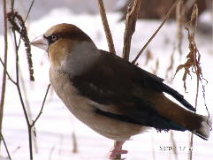 | 2002/12/29-2003/1/3 | 30日は、近くの知り合いの山荘にお呼ばれして忘年会となりました、「水餃子」と「八海山」が美味しかったですね。 31日には子供たちが集まってきました、小屋も久しぶりに賑やかです。夜遅くなるまで宴会が続きます、私達夫婦は生活のリズムが昼型なので早く寝ましたが、子供たち(と言っても30歳前後ですが)は明け方近くまで起きていたようです。どうも生活のテンポが合いません。 元日は昨夜以来の雪で真っ白、長男と次男は昼過ぎに早くも帰京です、若い人たちはやる事が多いんでしょうか、正月ぐらいのんびりしてても良いのになと思いますが。 2日には長女夫婦が帰ります、昨夜も雪が沢山降りました、管理事務所の除雪車が別荘地内の除雪をしています。午後長女夫婦を万座鹿沢口駅に送っていきます、帰りに「コメリ」によって残り少なくなったヒマワリの種を買います。餌台に置くそばから食べてしまうのできりがありません。 3日は午前中は小雪まじりの曇りで暖房を入れても室温がなかなか上がりません、午後からは日が差してきて室温も上がってきました、太陽のエネルギーを実感します。 夜半に入っても雪が降り続いています、4日帰る予定でしたが帰れるかな。 暮れから正月にかけての野鳥の飛来状況ですが、餌台にはシジュウカラ、コガラ、ヤマガラ、ゴジュウカラ、シメ、ヒガラそしてたまにアカゲラ、カケスがやってきています。そして最近大きい顔をしているのはアトリです、6,7羽の集団でやってきます。多い時はこれら鳥が餌台の周辺に十数羽たむろしています。 餌台には来ませんが庭の木に来た野鳥は、ヒレンジャク、キレンジャク、ミヤマホオジロ、ベニマシコ、ウソ(写真)、コゲラ、エナガです。ことしはマシコの仲間が少ないようです、見かけても1羽程度それも短時間です、昨年のように団体では来てくれません。 |
