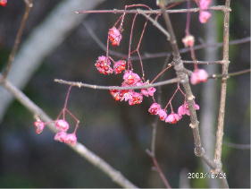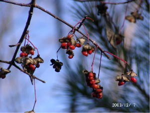 | 2003/10/25-26 | 小屋の庭は、ほぼ紅葉は終わり今は、葉を落としたカンボクやマユミの実が赤く目立っています。餌台や庭の木々に来る鳥の数が増えてきています、特にアトリは大群でやってきてシラカバの実を突っついています。また今回はアオゲラを間近でじっくりと見ることができ、ラッキーでした。 近所の道ばたで昨年と同じ場所にキノコが出ていました、昨年より量は多いようで食べきれないので一部は東京へお土産です。 | |