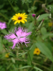 今回は鈍行列車を乗り継いでやって来ました。万座鹿沢口駅からはプリンスランドの巡回バスを利用します、このバスは小屋の近くまで運んでくれるので便利なのですが、本数が少ないので使い勝手が悪いためか万座鹿沢口駅からの利用者は少ないようです。この日も貸し切り状態でした。バスから降りて小屋へ向かう途中で小屋の鍵を持っていないことに気づきあせりました。鍵を先週こちらに来た息子夫婦に貸したままになってました。仕方なく管理事務所に管理用の鍵を借りに行くはめになり、徒歩往復40分大汗をかいてしまいました。今回は私一人だけですので、基本的には何もしないで庭など見ながらボーと過ごしました。食事を作るのも面倒なので、レトルト食品などで簡単にすませてしまいます。野菜など無しですが2日間のことなどで我慢します。 庭では、クガイソウやコオニユリは咲き終わっており、今咲いているのはシモツケソウやカワラナデシコ、オカトラノオ、カセンソウ、ギボオウシです。これから咲きそうな蕾を付けているのはユウスゲ、レンゲショウマです。 今年は天候不良のため、一般的に昨年に比べ植物の生育量が少ないように見受けられます、特に目立つのはハンゴンソウで、背の高くなる野草ですが今年は背が低く花着きも良くなさそうです。 | |
