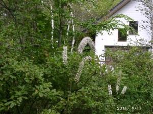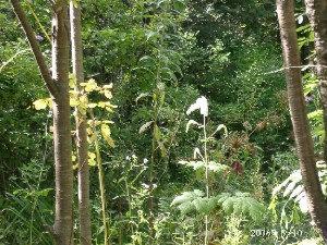 先週に来たばかりなので、庭の様子に大きな変化はありませんが周辺の山桜の葉が大分ピンク色を濃くしてきました。今庭で目立つのは白い大きな穂をつけたサラシナショウマとこれも白い花のゴマナです。彩としては昨年より本数は少ないですがベンケイソウの濃いピンクの花とアキノキリンソウの黄色い花があります。今年は全般を通じて天候が不順で庭の植生もここ数年とかなり違うと感じています。