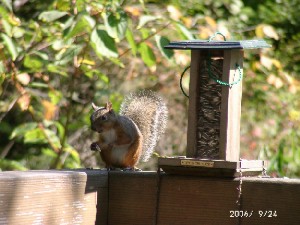 今回の三日間もはっきりしない天気でさえませんでした。鳥達の餌を取る量が増えてきました、一日に数回ヒマワリの種を補充するようです。このところリスもお出ましになるのでその分大量に消費されてしまいます。付近の小道で山鳥が歩いているのを二度ほど見かけました、ほぼ同じところだったのでねぐらが近くにあるのかもしれません。首の付近が真っ赤でたぶん雄でしょう。 | |