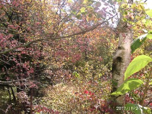 小屋の庭も紅葉の盛りで、白樺はすっかり葉を落としていますが、ニシキギ、レンゲツツジ、ヤマボウシ、カエデなどの葉が紅葉して庭が明るくなりました、今年は例年になくマユミが濃いピンクの実を沢山着けて特に目立ちます。野草ではリンドウが少し咲いていますが少し元気がありません。夏の間、他の野草にかなり圧迫されたのでしょうか。