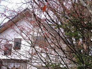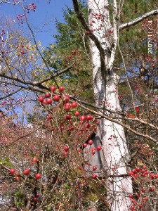 土曜・日曜と穏やかな晴天で気温も高めで過ごしやすく、日中は暖房も必要ない天気でした。紅葉はいわゆる団栗の木が最後に紅葉して、盛んに落葉をしています。今、林の中で鮮やかな黄色い葉をつけているはダンコウバイです、春まっさきに黄色い花を着け、山に春の訪れを告げる木が今度は秋の終わりを知らせています。木々の葉が殆ど落ちた小屋の庭で目立ってきたのがノイバラの赤い実です、6月下旬には白い花を沢山咲かせて庭にいい匂いを漂わせていましたが、今は寂しくなった庭のアクセントになっています。