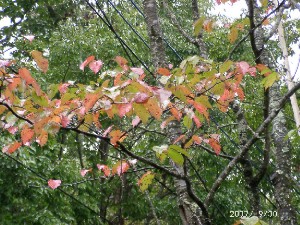庭の花も殆ど終わっており、カンボクやノイバラ、マユミ、ニシキギには赤い実が着いています。白樺の葉も大分おちています、ヤマザクラの葉はピンク色に紅葉を始めています。今年の暑かった夏も終わり秋が足早にやってきそうです。