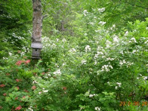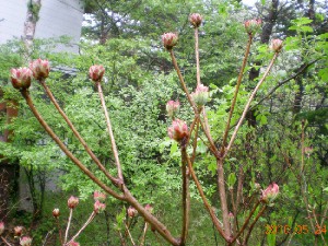私は土曜日、熊谷市内で元職場OB会があったのでこれに参加して夕方こちらに来ました。昨日から来ているかみさんに万座鹿沢口駅に迎えに来てもらいましたが鈍行を乗り継いで来たのでずいぶん時間がかかりました。高速を使わなくてもこれなら車の方が早いかも知れません、でもパーティー付きでアルコールが入りますので今回はダメですが。土曜日も良い天気でしたが、日曜日も良い天気です。この日はかみさんと二人でプリンスランドGCでゴルフ、浅間山をはじめ周辺の山々が綺麗です。スタート時間が早かったので昼過ぎにはホテルの温泉で汗を流します。 午後は庭のレンギョウの剪定、放っておくとどんどん上に横に暴れます、思い切って切ります。来年も沢山花を付けることを期待します。 夕方、知人に土地にあうのか増えすぎた「キョウカナコ」を株分けしてお譲りしました、今年の花芽は着いているので確実に咲くと思います。来年は彼の管理次第と言いましたが。 庭ではレンゲツツジが満開をむかえていますが、今年は花着きが良くありません。小屋の庭だけでなく付近でもあまり良くありません。開花も10日以上遅れたし、レンゲツツジにとっては条件の悪い年なのでしょう。 野鳥は以前のようには餌台に来ません、昆虫も多くなったし餌は十分他で取れるのでしょう。水盤には時折水浴びにガラの仲間やキビタキ、メジロなどが来ます。 それから右の写真にある植物が出てきました、何なのか分かりません。私もかみさんもはじめてみました、薄紫色の蕾を付けているようですが何でしょうね? |