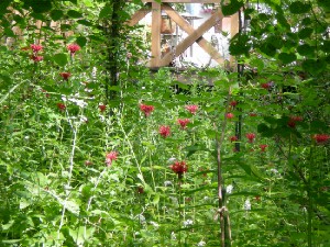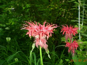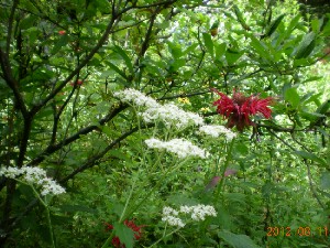 小屋の庭では赤いベルガモットの花盛りです。以前は一カ所だったのですが今では庭のあちこちで咲いています、強い花ですね。![]()