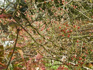 小屋の庭の紅葉は終わりの始まりといった感じです。山桜のピンクの葉や桂の黄色い葉も大分落ちています。レンゲツツジやニシキギの葉が色づきはじめ、ヤマボウシとモミジの紅葉が盛りで綺麗です。まだシュウメイギクが咲いていました、蕾も未だあるので当分咲き続けそうです。また、今年良く咲いたノイバラが赤い実を沢山着けています。ヤマガラなどの野鳥が餌台に頻繁と通うようになりました、瞬く間にヒマワリの種が無くなります、リスも食べに来るので一日に何回も補充が必要です。 |