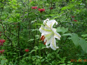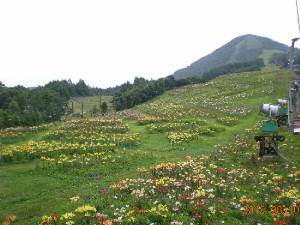鹿沢スキー場に夏の間、「鹿沢ゆり園」が開かれて数年たちますが未だ行ったことが無かったので、行ってみました。スキー場へは小屋から一番近いスキー場なのでしばらく前まではよく行っていましたが、最近はシーズンに1回、良くて2回ぐらいしか行かなくなりました。厳冬期に小屋へ来る頻度が少なくなったことが一番の原因です。ゲレンデは堅く滑りやすく比較的好きなスキー場です。さて肝心な「ゆり園」ですが平日の午後ということもあり、お客さんは少なかったです。スキー場のメインのゲレンデの部分2番リフト途中まで色とりどりの百合が植えられています。植えられて何年もたったものが多いようで背丈の高い百合が多いです。歩いて上るのはきついので一番リフトに乗って上っていきます。眼下に色とりどりの百合が咲いていてとても綺麗です。1番リフト終点で降りて、百合の中の小道を歩いて下っていきます。ゆり園はその上の2番リフトの途中まであるようですが、2番リフトは動いていませんし、終点の少し上で立ち入り禁止となっています。上部からからゆり園が俯瞰できます、遠くには四阿山、近くには田代湖なども見えますが夏は水蒸気の多いせいか冬期と違いすっきりとは見えないのがざんねんです。 ![]()
