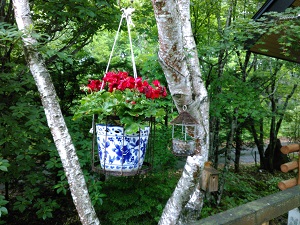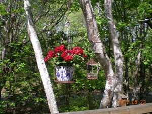 桜草が咲いています、この桜草は自生のものではなく頂いた園芸品種のも移植したら毎年咲くように根付いたものです。乾きに強い種類の植物を地植えせず鉢のまま雨に当たるデッキなど置いたり、吊るしたりしています。 毎年、結構天水だけで生き延びていますので今回も鉢を自宅からいくつか持って行って置いてきました。 | |