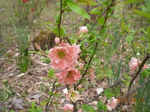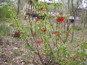 庭の山桜は散ってしまった後で今年はついに山桜の花に会えませんでした残念。今はボケ、ユキヤナギ、レンギョウ、山吹などが花盛りです。毎年のように枝先を野兎に食べられて成長も遅く良く花もつかなかったのですが、最近はそれでも少し大きくなったことと網で囲った効果で良く咲くようになりました。 ![]()