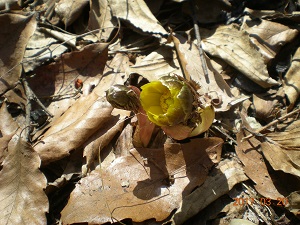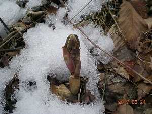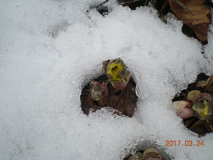 今月20日に帰京したばかりなのですがまたこちらに来ました。こちらではこの間に雪がまた降ったようです。数センチ程度の降雪であったようで別荘地内の道路には雪はありません。一応除雪作業車が動いたようで路肩に除雪された雪が積まれています。小屋に到着したのですが駐車場の積雪は数センチなので問題はないのですが路肩に積まれた雪が障害になりそうなので除雪することにしました。冬季に来るときには念のためゴム長靴とプラスチックの軽量スコップを積んでくるのですが今回は全く想定していなかったので、小屋に常備しているダンプ型の大型雪かきを使いました。雪は25日から26日にかけても降り6センチ程度降りましたが車を四輪駆動車に変えたので不安なく帰京できました。 前回来た時に花が咲き始めていた福寿草は降雪の影響か思ったよりも伸びていませんでした。