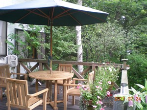 | 2017/7/20-24 | 白い花をつけるヤマアジサイも咲きました。日陰でも良く咲くので来年はもう少し増やそうかなと思っています。 デッキに置くテーブルセットを白いプラスチック製のものから木工品に変えました。プラスチックは劣化やカビなどによる変色が酷く思い切って木製にしてみました、経年変化で灰色になるそうですが幾つかの取扱店で現物を確認してから購入しました。この手のものはカタログやインターネット通販には馴染まないと思います。 | |