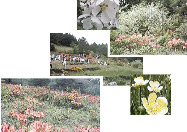 登り口の地蔵峠周辺はこの時点でほぼ満開状態です。とくに「湯の丸牧場」は見事です。下部ではレンゲツツジに混じって金鳳花(ウマノアシガタ)も群落を作って咲いており、観光客のおばさんに大人気でした。