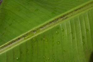 ヘモドムルさんによると、バーコードは「banana bunchy top(バンチートップ、以下BBTと記)」 というウィルス病の症状ではないかということでした。 これはバナナアブラムシが寄生することにより感染し、人の手や農機具を介してはうつらないけれど 子株には必ず垂直感染するもの、だそうです。 BBTその他の病気に興味のある方はこちらもどうぞ(英文) http://www.agnet.org/library/abstract/eb418.html バーコード以外の異常は、カビによる病気と農薬や肥料などによる濃度障害を可能性として指摘されました。 そーなんです。茶や黒の斑点や葉の一部が白く変色したのは、 通販などで有名な某植物活性酵素液を葉面散布してから急に出現したのです。 (最初に斑点が出現して、その周りから白くなっていきました) 酵素液の濃度が、弱っているバナナには濃かったのかもしれません。 が、これは新しい葉の成長とともに回復していく可能性がありそうです。 **** でも、でも、でも、 BBTに関しては感染してしまったバナナの株は諦めるしかないそうです。 対策はなく、次第に枯れていくとのこと。 私のバナナはBBTでも不顕性感染型らしく、すぐに枯れ果てることはないけれど「もう結実は無理でしょう」とのことでした。 言われてみれば、もうすでに葉っぱは40枚目を越えています。 本来の健康なバナナなら葉っぱが35枚前後出現した時点で開花するはずですが。 ヘモドムルさんのお話では、バナナは結実しようがしまいが、ある程度まで成長したら世代交代をしてしまうそうです。 つまり私の1号・2号はそろそろ寿命をむかえるということです。 私の横でヘモドムルさんの話を聞いていた長女がひとこと「ガーーーーン!」 私の次にバナナの収穫を楽しみにしてしていたのが彼女なのです。 「あとはもう、葉っぱが風にそよぐ姿を楽しんで下さい」という言葉とバナナに関する分厚い洋書 4月24日のことでした。 *** それにしてもこのひろ〜〜〜〜いネットの世界で、非常にバナナに詳しい方と知り合って、その方が我が家のご近所だったことにとても驚いています。 私が「庭は散らかっています」と言ったせいで気を使われた為か、本当にバナナの葉っぱだけを見つめて帰って行かれたヘモドムルさん。 とっても不思議な雰囲気を持った紳士でした。 |