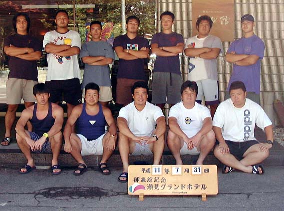 | 恐怖の山形合宿99 何が恐怖かっていうと、おかしくて腹筋が痛くなることが多数あるのだ。その犯人ともいうべき人間は、前列一番左の山本聡選手、そのとなりの贄田コーチ、後列一番左のワセリン直こと高橋直之選手の埼玉勢である。特に贄田コーチと直が一緒にいるともうダメ。練習後や打ち上げでは面白おかしい話が絶えないのだ。 最終日の打ち上げでは高桑選手がべろんべろんに酔っぱらってしまい、その酔い方がとても可愛らしかったのが印象的でした。 しかし、練習自体はものすごく辛い。何が辛いかって・・・みんな集中して投げるから、試合で6本投げるような感覚で練習するので疲れるのだ。おかげでみなさん夜はヘトヘト。とりあえずみなさんのヘトヘト写真を見て下さいね。 集合写真は前列左側より、さとしこと山本選手、贄田コーチ、きょひぃこと日渡選手、杉浦選手、まじんぶぅこと高桑選手、後列左側より、ワセリン直こと高橋選手、つね、廣瀬選手(東大)、西藤選手(筑波大)、成田選手(中大)、吉真選手、碓井選手。 練習期間中、お世話になった宿は、合宿免許の方々でいっぱいであった。我々が午前の練習を終えて昼食のために宿に戻ったとき、あまりにもでかい奴らばかりが集団で帰ってきたのを見て、その方々は私たちのことをどこかのプロレス団体と本気で思っていたらしいです(笑) |