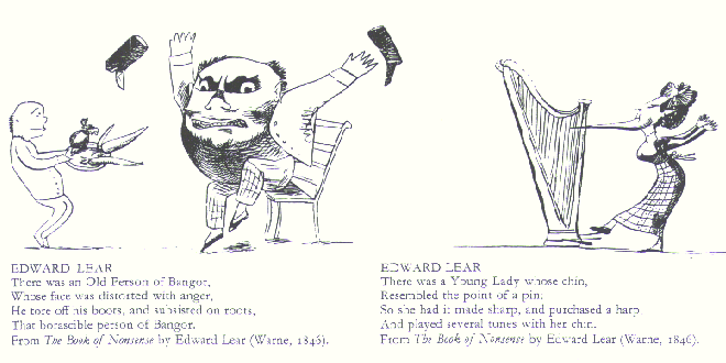 Edward Lear (1812 - 1888) 21人兄弟(!)の末弟としてロンドンに生まれた。小さい時から身体が弱く、てんかん・喘息・気管支炎を病んでいて50才まで長姉に面倒を見てもらっていた。 独学で美術・哲学を学び、15才で鳥の絵を描く職業画家になった。博物史上に残る手彩色石版画集「オウム・インコ類」を手掛けたのはわずか18才の時である。不幸にもこの企画は未完に終わったが、その仕事は高く評価され、19才にしてロンドン動物園の設計を任されるという栄誉をになった。(1831) 1846年に「ノンセンスの歌」を発表しノンセンス詩人としても広く知られるようになった。この本のイラストは鳥の絵とはまったく趣が違っている(図版参照)。同年王室に招かれてビクトリア女王の美術教師を努める。その後ヨーロッパ放浪の旅に出かけ、中東まで足を延ばし、各地の地誌・風景画・動物画を描いた。また、自然誌・韻文・小説など多くの作品を残した。 変わり種の多いこのイラストレーター・リストの中でも、最も異色ある人物だろう。
