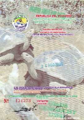 じわじわと進んで口蹄疫予防のマットを踏み、入島カードを提出します。荷物検査があり、その後一人100ドルの入島税支払いがあります。いっきに財布が軽くなりました。代わりに「ガラパゴス国立公園入園者証」を貰います。ナンバーは134373番でした。95年版の「地球の歩き方」で6万台だったと書いてあるので、6年間で倍以上になったわけです。しかしそれだと年間1万人程度で、千葉にある東京ディズニーランド(一日5万人だとか)なんかに比べるとほんのわずかな数です。もう一つの空港(サン・クリストバル島)もあるので実数はもっと多いのでしょうが、入島が厳しく制限されている様子はわかります。