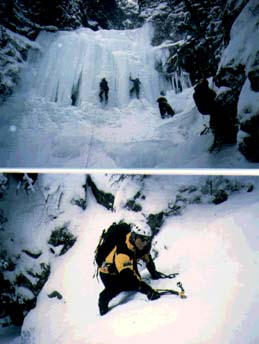 1月20日(土)八ヶ岳広河原沢右俣クリスマスルンゼの大滝 メンバー:忠さん、文さん、川崎カメラマン、ぴか+もも 朝、原村の丸山別荘地で待ち合わせて、車で舟山十字路から 少々入る。 9:30(歩き始め)-11:00(右俣と第三ルンゼの分岐)-12 :00(クリスマスルンゼ大滝登り始め) トレースあり。 分岐からの滝はほとんど埋まっている。 大滝は結氷状態が甘く、水が流れている。川崎さんがMt.D axから道具を借りてきてクウォーク、アクサーを使用できた。 大滝は50Mほどだが、二段に分かれていて途中の棚まで25 m、上部垂直部が25Mくらいか。 ぴか+もも、忠+川崎パーティーで下部を登る。文さんはフリ ーソロ。 上部は、忠+文、ぴか+川崎のパーティーに変更。 忠さんは中央部左の傾斜のきついところ(V)、ぴかは右より のやさしそうな凹角(IV+)を登る。 プロテクションはそれぞれ5本ほど。氷の状態は思ったより良 く、アックスが良くささる。 文さん、川崎さんはそれぞれのルートをフォロー。 登り終わった頃雪が降出し、懸垂で降りる。支点は横たわった 丸太から。 15:00(登攀終了)-16:30(駐車場)