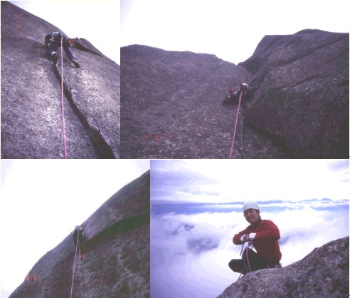・ルート 大ヤスリ岩/夢のカリフォルニア3P(5.10-、5.7、5.10)+ハイピ-ク・ルート上部2P(Ⅲ+、A1) ・メンバー pika&chu ・内容 日帰りはきついので、前夜、大泉ラッセル邸泊。AM5:00起き、6:00出。 増富温泉経由で瑞牆山荘へ(40分)。 7:00発。金峰への登山道を辿り、富士見小屋から瑞牆方面へ左折。 取り付きは登山道沿い。明るく明瞭。8:40着。 頂上は間近で大勢のハイカ-が見えます。 ルートは大ヤスリの前衛に位置するナイフピークの南壁に入ったクラックです。 現在7つのクラック・ルートが開かれていますが、殆どがワイドの要素を含んでいて、wildです。 その中で、レイバックを駆使する”夢のカリフォルニア”はスポーティなイメージがあって、長い間、 僕の心を捉えていたートの一つでした。 1P目、chuリード。5.10-の美しいフレークが10mくらい続きます。 寝てるように見えましたが、スタートしたら、パワー全開でした。 2つキャメをとったあとフォール。これで怖さが消えました。 あと2つありがたいキャメ#4と、トライカム#7をsetして気の抜けないオフィズスから、ビレイ点へ。 レイバックは右引きなのに、どういう訳か右手でカムをsetしないと、バランスがとれず、つらかったです。 腕が張ってしまったので、2P目をpikaにゆだねました。 ここは快適なハング(5.7)からハンドクラック(5.7)を抜けて、外傾テラスのビレイ点へ、20m。 3P目、1P目同様の美しいフレークで、上部がハンドのコーナーになっています。 2P目のハング越えのポイントから見えたこのラインは、日本離れしていて非常に印象的でした。 pikaは、出だしのオフィズスに少し手こずりましたが、フレークのレイバックをこなし、コーナーを使って巧みにレスト。 抜け口のハンドを持ち前の粘りでうまくこなしてオンサイトしました。 でも、本人は中間部に2本リングボルトがあって、これにクリップしたことに少々気がとがめていたようです。 (大きなカムのなかった頃は、他にプロテクションは取れなかったんでしょう) ビレイ点のすぐ上が、ナイフピーク肩のテラス。 大ヤスリは目前ですが、手前のルンゼ状広場にいったん5mラッペルします。 大ヤスリ側の簡単なクラックからチムニーへ入り(Ⅲ+、20m)、 2ポイントのエイドで大ヤスリのテラスへ。 瑞牆のピークや、登山道を行き交うハイカーのおじさん、おばさんたちのあたたかい(?)声援にマメに手を振りながら、 恐ろしいスピード(20分!)でpikaが大ヤスリの先端へ(40m、A1)。 20年前の”聖子命”は消えていた!!(これ分かるひと、いるかな?) 経歴不明のビナ一個で、ラッペルするのは気が進まず、コングの”人食いビナ”をドネーション(これも25年モノだけどね)。 大テラスからは北側(本峰側)に15mほどのラッペル(しっかりした支点あり)で登山道に戻りました。 取り付き着13:00過ぎ(正確な時刻は忘れちゃった)。 予報はあまりよくなかったけど、時々日も差し、概ね暑からず寒からず。 ケイタイから下界はどこも大雨(アフガンには爆弾の雨)という話が伝わってきました。 僕達は今日もラッキーなクライミングができました。僕達は好きなことやっていられる世界にまだいます。 でも、そうではないひとたちが大勢いることが、いつになく気がかりになりました。 以上 追記>下山途中で、なんとオコジョと対面。実物をこんな間近で見るのは初めてで、感激しました。