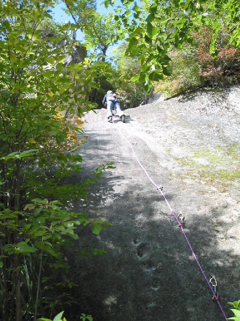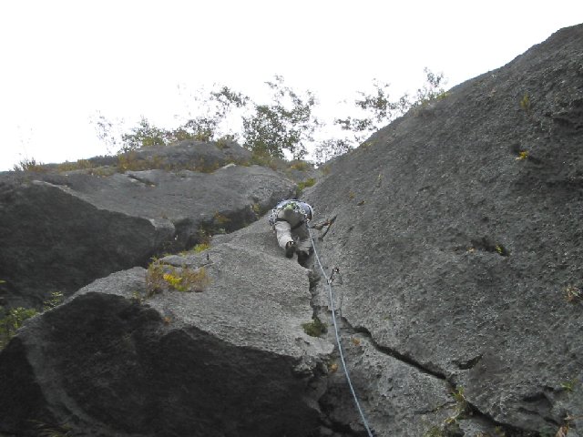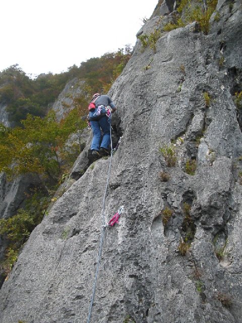 ARCのみなさま チュウサンと健治さんにお付き合いいただき、二子山の中央稜を登ってきまし た。 いや、長かった。長いってルートが長いんじゃなくて、取り付きに着くまでが 長かった。いちばん長い思いをしたのは、健治さんです。 1行程 10月11日 6時柏宅発……チュウサンの車が湾岸線でパンクし、ウチの車に乗り換えて出 発。その後、大渋滞やその他いろんなことにはまる。 13時頃 中央稜登り始める……ということで、登攀開始がすっかり遅くなる。 15時半頃 終了点(6P最後)着 4Pの懸垂下降で取り付きへ。……最初の懸 垂(ダブル)で回収の時引っかかって取れなくなり、チュウサン登り返し。原 因はロープの激しいキンクだったようだ。 17時頃 取り付きに戻る。ヘッデンつけて車へ向かう。 ★帰りは、スーパー銭湯彩の湯(休日700円)に浸かって、ロビーでサッカー ・ルーマニア戦を観戦して帰ってきました。日本チーム、めきめき強くなって いて感動! 2メンバー 伊藤チュウ、クルミザワ健治、カシスミ(全員ARC) 1P チュウサンリード 2P スミリード 3P 健治さんリード 4P チュウサンリード 5P チュウサンリード 6P スミリード ルートファインディングの難しいピッチをチュウサンにリードしてもらい、い ちばんお気楽楽しい2Pを私がもらっちゃいました。健治さんリードの3Pは、中 央稜のハイライトでした。 雨が降りそうで降らない曇りの中登ったので、暑くもなく快適でした。 やっぱり、お山の岩場は楽しいです!