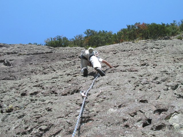 みなさまへ 本日、10月27日(月)日帰りで城山へクライミングに行ってきました。 メンバーはチュウサン、けんじさん、金森の3名。天気は上々で汗ばむほどで した。バトルランナー(4ピッチ)を登りました。1ピッチチュウサン、2 ピッチ金森、3ピッチけんじさん、4ぴっち金森がのぼり、核心の2ピッチ目 のハングで金森が痛恨のフォールをした以外は順調に登り終えることができま した。下降は懸垂3ピッチで取り付まで降りました。水も食糧も持っていかな かったので喉がからからおなかぺこぺこでした。 この1本で満足し、大仁温泉で汗を流し帰京しました。 10/27 10:00城山 南壁バトルランナー登攀開始 13:45登攀終了 メンバー:伊藤忠男、楜沢健治、金森智