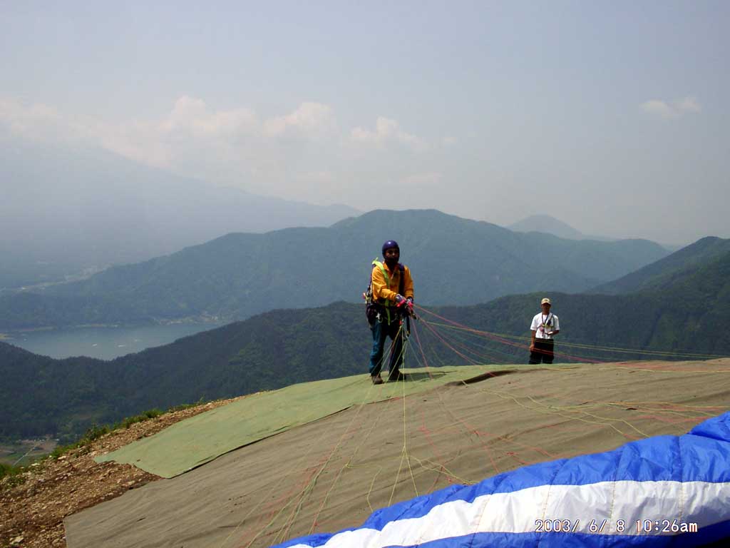 6月8日 御坂山系をとぶ 伊藤フミヒロ 御坂周遊コースを飛びましたので報告します。 大石村をベースとする河口湖スカイリゾートのパイロットコースエリアの外縁をほぼ半周するルートで、御坂山塊の主峰黒岳、 十二が岳などのピークがあります。 馬蹄型のルートはほぼ20キロほど、行ったり来たり紆余曲折があるので実際には35キロほどの行程でした。所要時間は1時間 45分。 1030時に1250メートルのテイクオフを離陸、そのままサーマルにのって1500メートルまであげて、支尾根をいっきに1600 メートルの主稜線に登りました。芦川村が目の下、甲府盆地がみえる。山は南アルプスに八が岳、三つ峠など。そこでさらに2 00メートルほど上げて西へ大石峠経由節刀ガ岳まで、高度が下がってきたので、ここまでか、と来たルートを戻る。新道峠で 2000まで上がったのでそのまま黒岳に向かう。あっというまに黒岳上、前回低高度で苦労してやってきたのがウソのよう。 そのままアクセルを目一杯踏んで、再び節刀ガ岳へ。フォロー気味の風であっというまに節刀ガ岳、さらに金山に到着。 目の下にもうひとつピークが見えるので十二ガ岳かと、曾遊の岩場を見に行く、がそれはエリア外の鬼ガ岳だった 。東に転回して本当の十二ガ岳を目ざす。例の岩場は足下にあった。サイコがきれいだ。 毛無山の北側をぬけてランディング850上空に戻る。高度がまだ1200なので河口湖へ向かう。湖上にでたと おもったらあっというまに対岸に到着、ここはエリア外なのでUターンして、高度を落としながらラン ディングした。パラを始めて11月。念願の周遊フライトでした。 使用機体:フライトでザインのストリーム