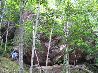 レンガ色の印象的な岩塔が、林道沿いに点在。