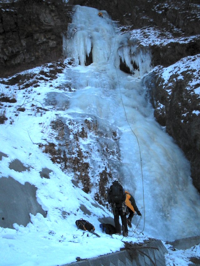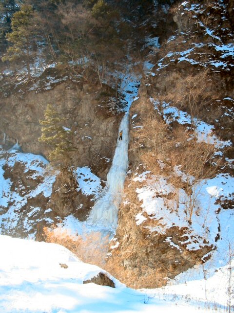 1/31土曜日、南ア櫛形山北面、上荒井沢、日帰り。 メンバーはちゅうとけんじ、現地で澄ちゃんの弟分、I君を含む雲稜の3人と合流、11:00。 今シーズン初めてなので、一番簡単そうなカモシカルンゼを登った。 ボクとけんじさんはF1(60m)のみで下降。 雲稜の3人が登るまで2時間以上かかってしまったから、これだけで、もう15:00。 彼らはF3へ向かって消えた。 F1は、Ⅳ+と報告されているが、この日は気温が高く、緩んだせいか、もう少し上に感じた。 ポイントは急な5mほどの中央のランペだが、全体を通して平均した傾斜で、気が抜けない。 スクリューは9本使った。 ここは以前から目をつけていたが、昨年、いきなりR&Sで紹介されて、人気を呼んでいる。 なにしろ、林道から取り付く感じだし、車高のある車なら、歩きがほとんどない。 ボクのタウンカーでさえ、Pから20分程度で最初の滝(見ごたえのあるトリコルネ)に着く。 林道は東西に走っているので、”氷”エリアを忘れるほどに、明るくて、快適。 陽だまりでビレイってかんじだ。 この日も、林道のあちこちに10数台の車が止まっていて、氷壁に移動するクライマーとあっちこっちで出会った。