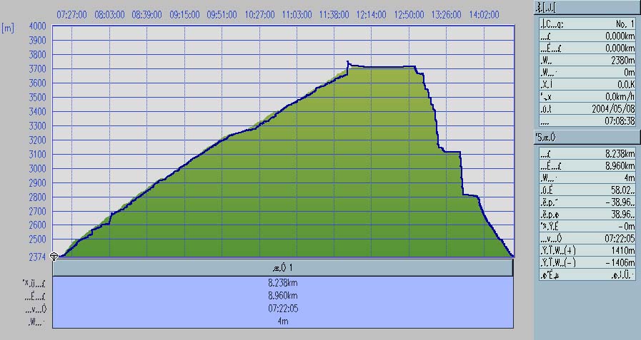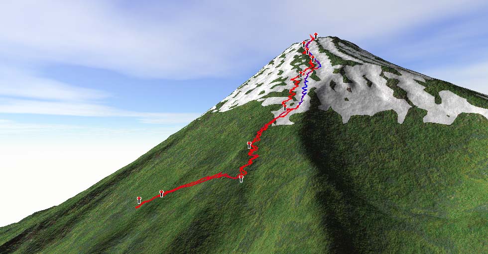 富士宮口スキー 05/08 5合目駐車場0715発。川崎亀も同行。良い天気。雲海である。汗をかかないペースで休みなく1145頂 上着。和久津清もやってきた。0100みんなで一緒に滑る。快適なザラメ。6.5合小屋2800mまで滑る ことができた。1430駐車場。雪渓の幅は例年に半分。来週以降いくのなら吉田大沢がよいだろう。 <きしゃ> orignal gps data [.gdb]file 富士宮口スキー 04/29 メンバー 川崎カメ きしゃ 成田まちゃえさんを撮影。 3100メートルの第2雪渓の上部までのぼって滑る。6合の小屋の上標高100メートル(2600m)まで滑ることができた。 チョーざらめでらくらく。 テレマーカー1人が頂上から降りてきた。ほかに人影あまりなし。
