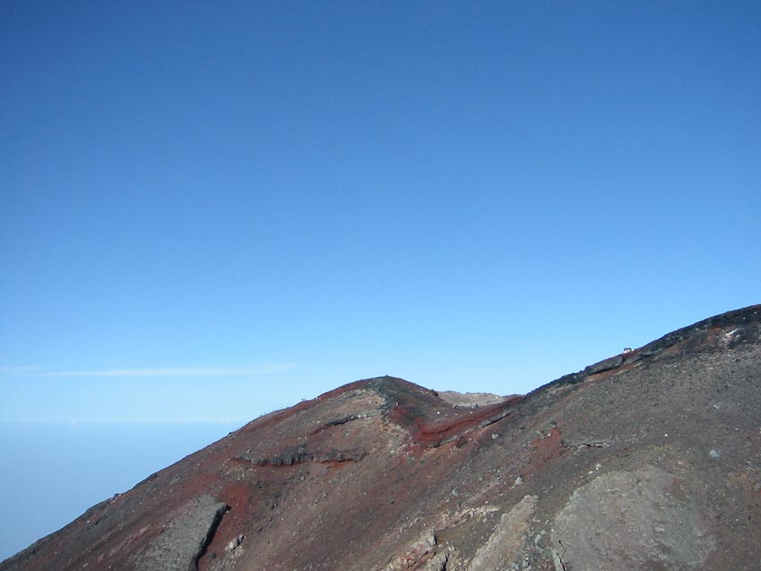 仕方がない。来た道を戻る。再びにぎやかな小屋前をぬけて、一方通行の下山路となっている須走側をのぞいてみる。お釜のふちの岩壁が西風を防いでくれているのか、風は悪くない。グライダーを広げるスペースもあるのだが、ご来光を拝んで、さあ下山、という人たちの行列が目の下に続いている。こんなところでパラグライダーをひろげたら黒山の見物客が出現することは明らかだ。