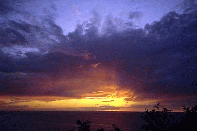 解説:夕暮れ時の海だが、夕日の輝きが炎のように