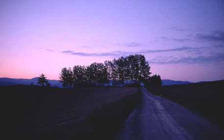 解説:夕暮れ時の田舎道。ある人は家路を急ぎ、