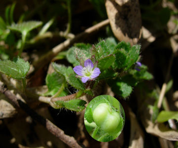 花の大きさは兄弟の中で一番大きく見事なオオイヌノフグリ。どこの空き地でも見つかる有名犬ですね。 イヌノフグリと同属(ゴマノハグサ科クワガタソウ属)で花が大きいのでこの名前をいただいています。 |