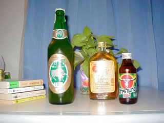 ビールのコーナーに並んでいるからたぶんビールだと思うのだが、雄牛のマークの妙な瓶。ラベルに書かれているのはすべてタイ語なので、飲んでみないとわからない。コップに注いでみたが、色はビールに似ているものの泡などまったく立たない。酢のような臭いがする。飲んでみると甘ったるい。化学合成のクエン酸と安い酢と気の抜けたファンタレモンを混ぜて三日くらい室温で放置したような面妖な味がする。いったいこれは何なんだ。どなたか、ご存じではござらぬか。