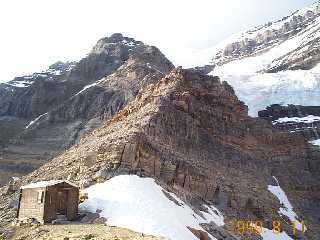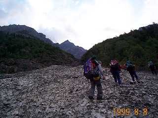 小屋まで14時間かかったという資料もあり、早めに出発した。Great Couloir 下端の雪渓から取り付き、沢の右手の樹林帯に入る。赤布がこまめについている。下山ルートと合流してしばらく登ると樹林帯を抜けてガレ場のトラバースぎみの登りとなる。亮子さんやや遅れ始め、荷を分ける。睡眠不足か時差のせいか体調いまいちらしい。水場を過ぎて逆層ぎみとなった部分を注意して通過すると壁の下のカール状に出る。雪渓通過の際に亮子さん滑落。雪渓末端のガレまで落ちたが、傾斜がゆるく、擦り傷と軽い打ち身ですんだ。稲垣さんがすばやくグリセードで助けに行った。
