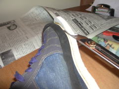 いいかげんくっついたら(2時間ぐらい?)はみ出したフェルトを切る。力がかかるので、カッターよりもナイフがよい。切れ味が悪いと全然進まないので、よく研いでから。 靴底の端から垂直に切りたいのだが、なかなか難しい。 |