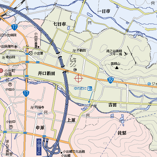 拡大図。高速からなら、小出IC出口を左折、17号に当たったら右折、「井口新田」交差点で奥只見方向に右折。商店街を抜けて高速をくぐってすぐ右手です。